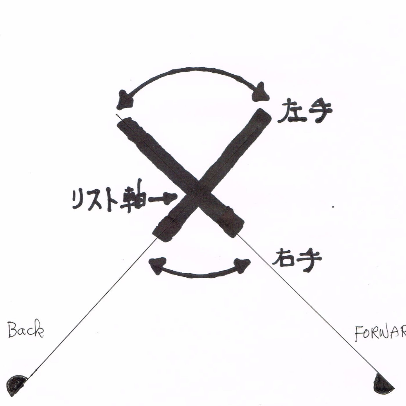両手グリップ中間の(丁度、右手小指の近くにある)リスト軸が、クラブの回転の中心になっています。